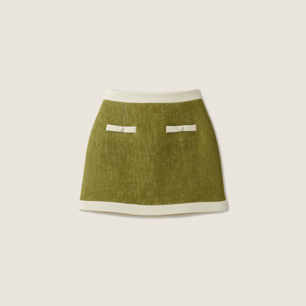 Features: Crafted in a wool-blend fabric, this mini skirt is defined by contrast-trimmed waist and hem. It is finished with two petite patch pockets, adding a delicate touch.