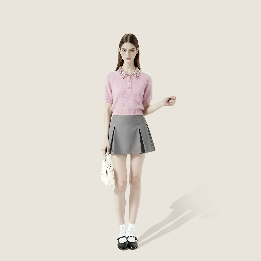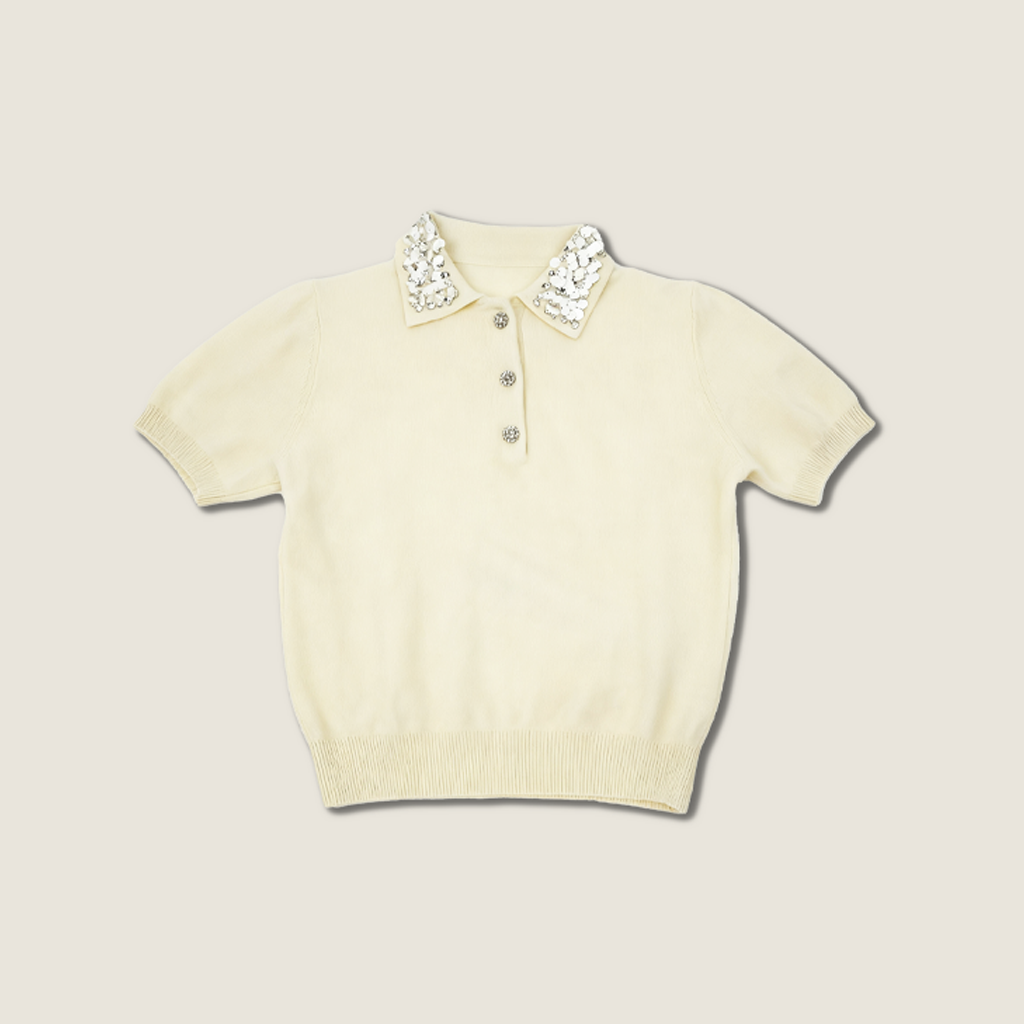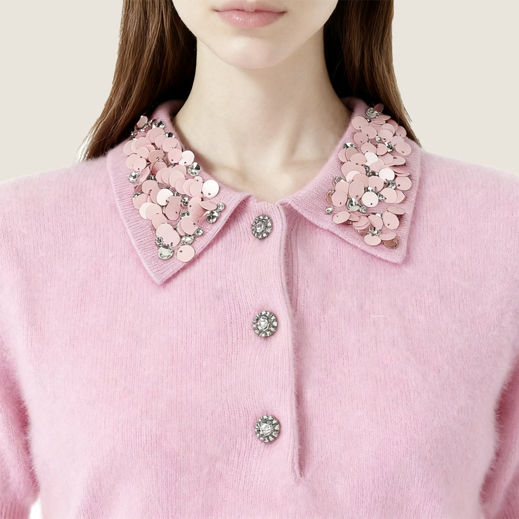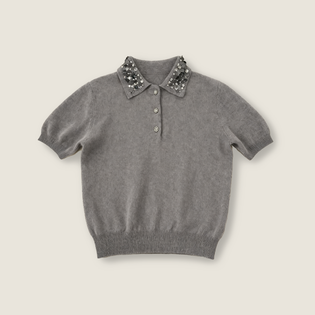 Features: Defined by its sophisticated polo design, this piece is elevated with crystal embellishments on the collar, adding a refined touch of sparkle. The soft wool-cashmere blend ensures both warmth and comfort, creating a luxurious feel.