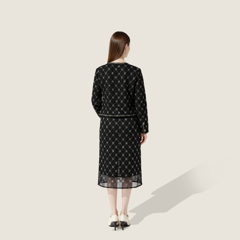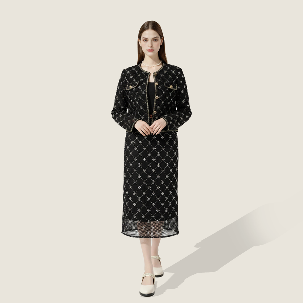 Fit: With a tailored jacket and flowing midi skirt, this set creates a balanced silhouette, offering a chic and flattering fit for a feminine, polished appearance.