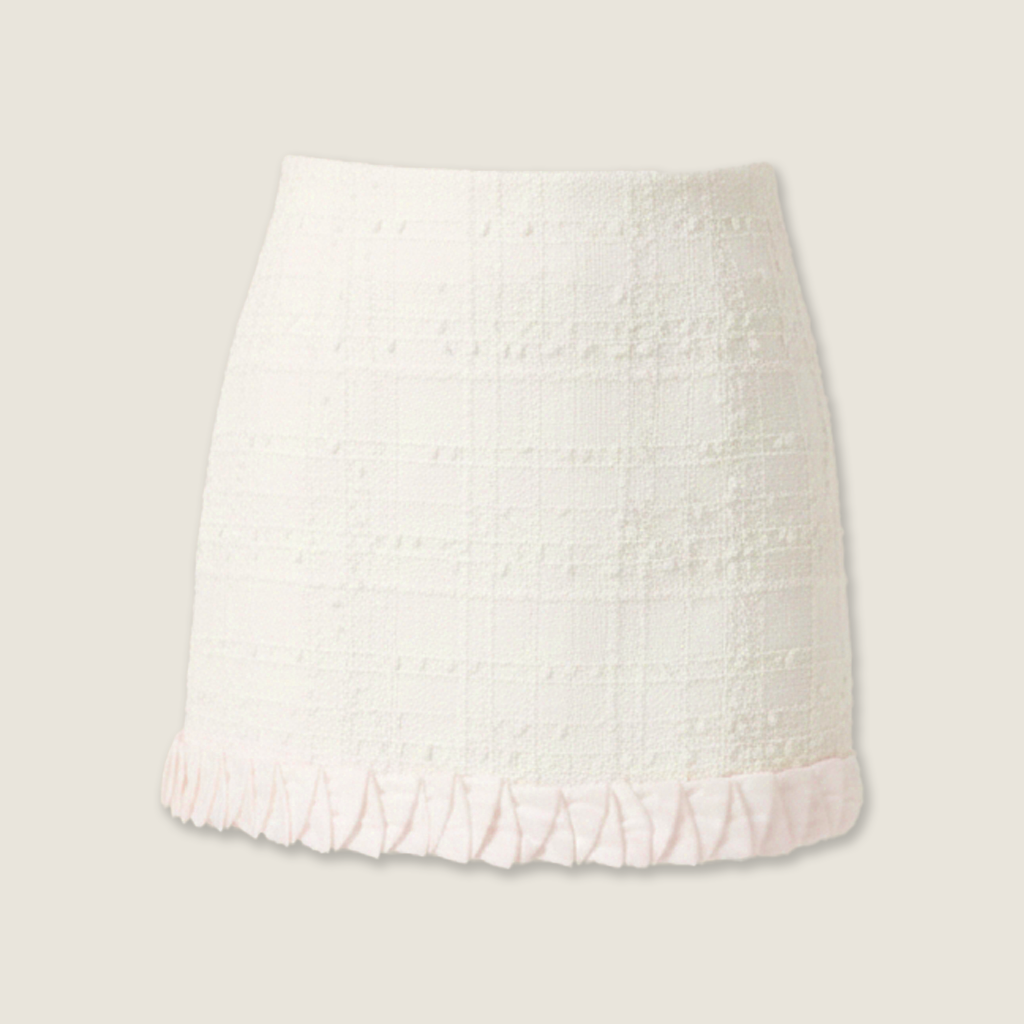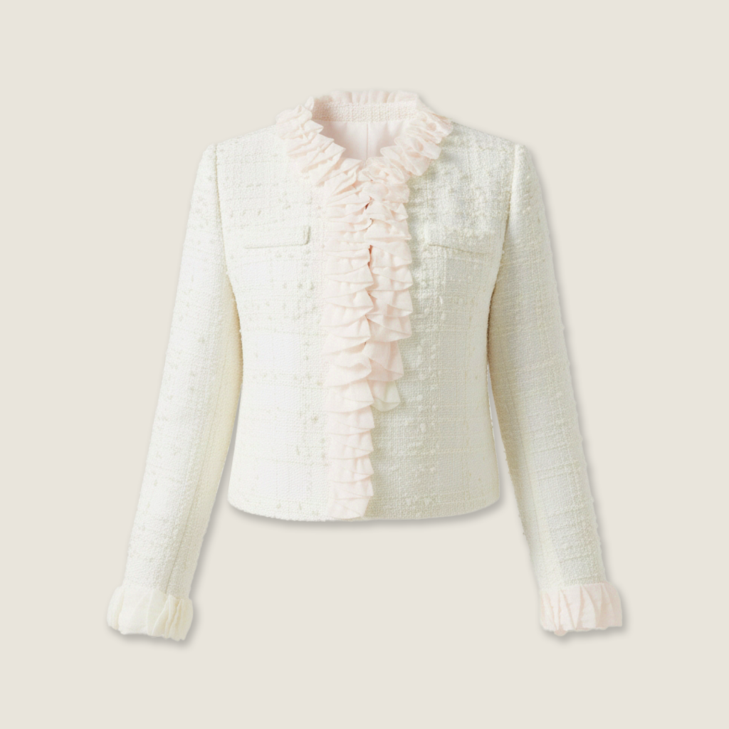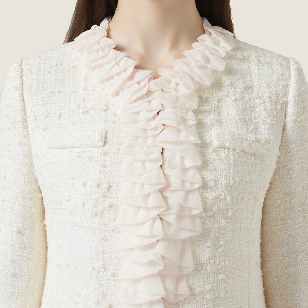 Features: The set is crafted in a richly textured tweed, elevated by soft ruffle trims along the jacket front and sleeve cuffs, and delicately layered hem details on the skirt. The interplay of structure and softness creates a polished yet feminine balance.