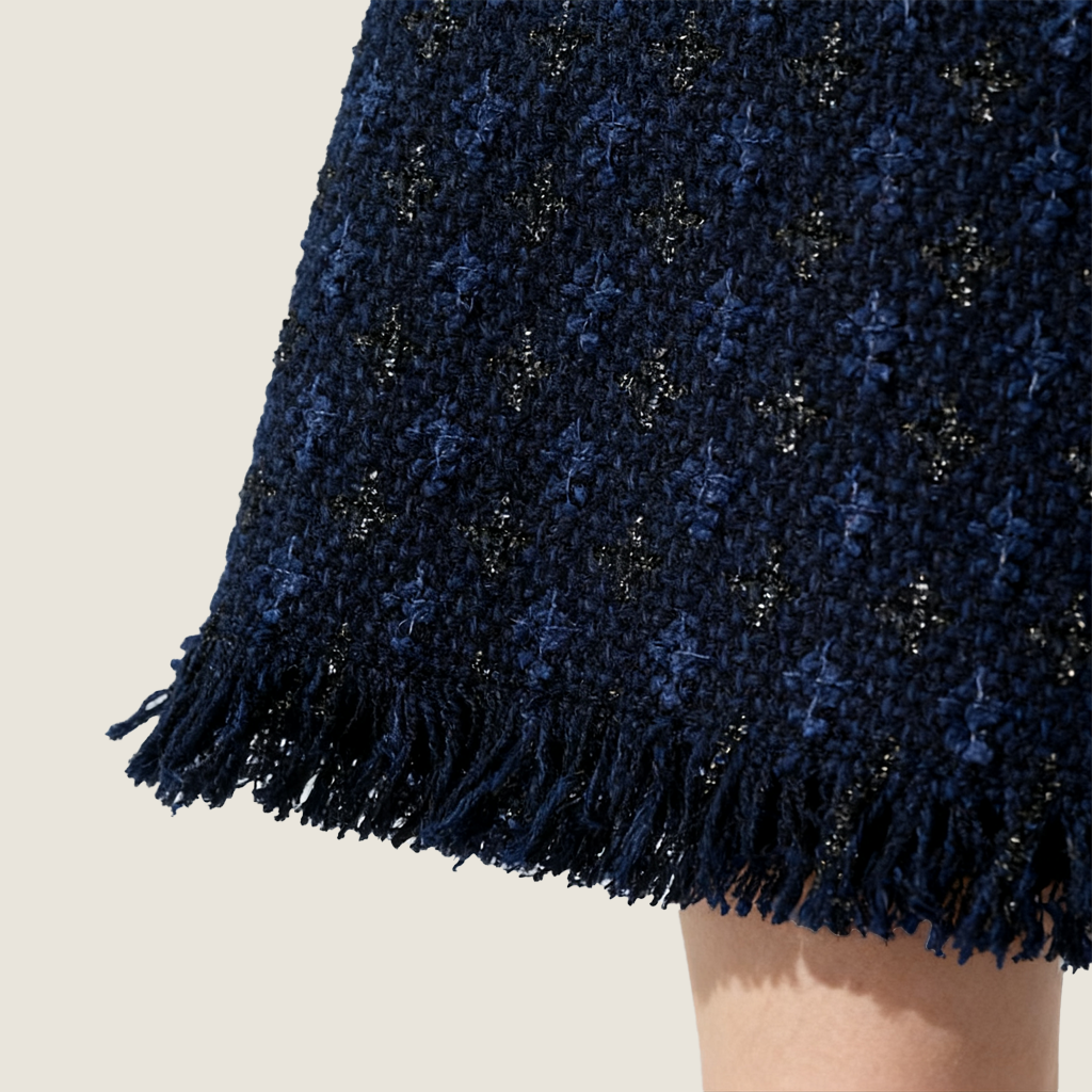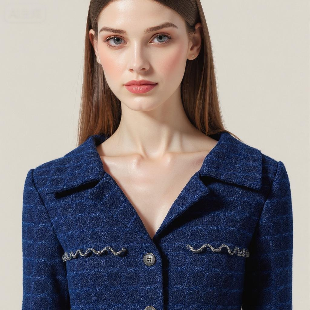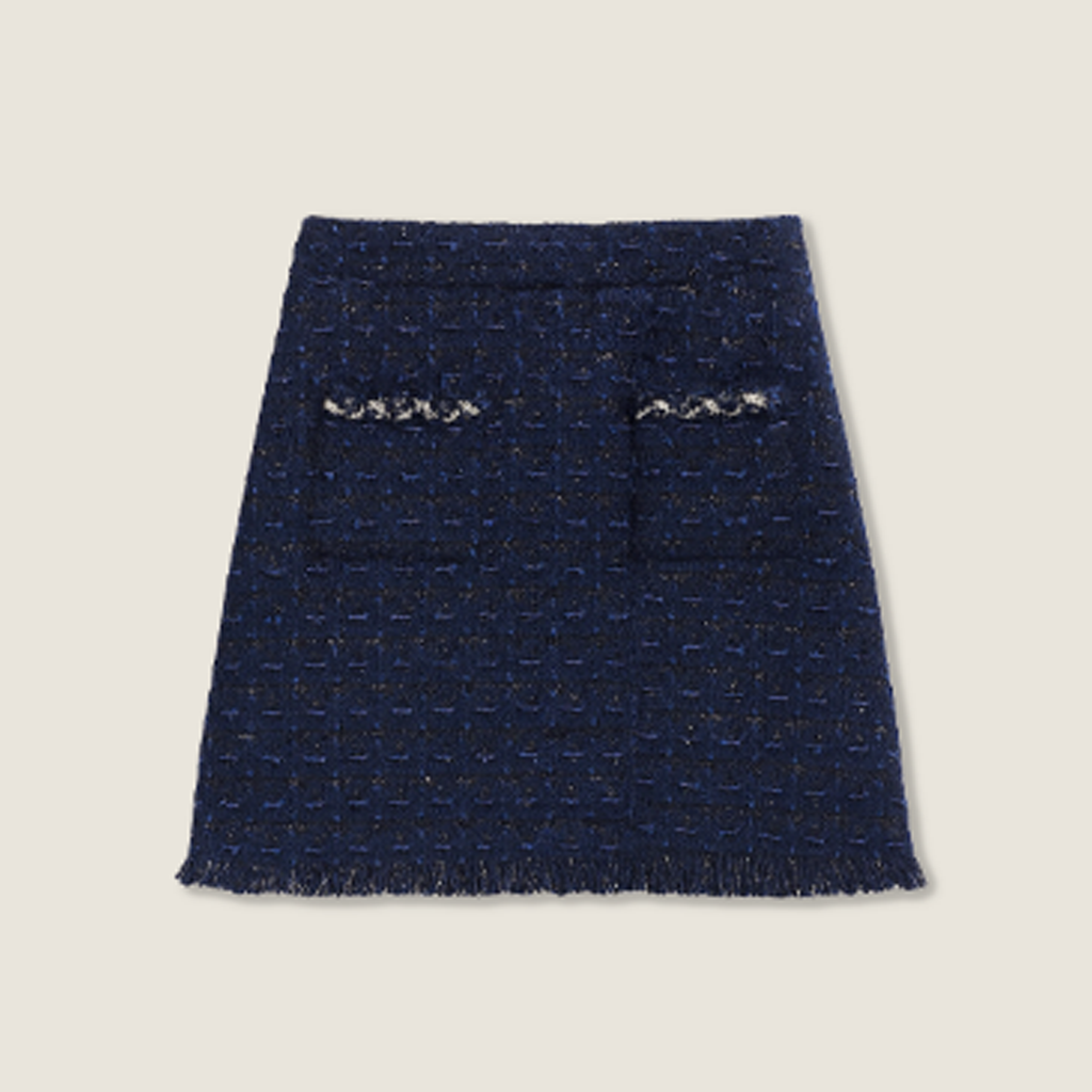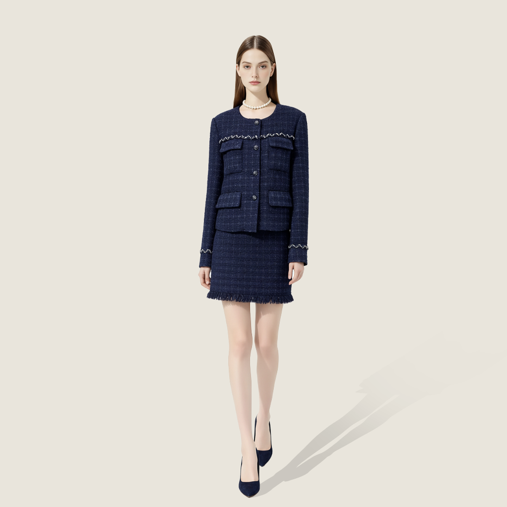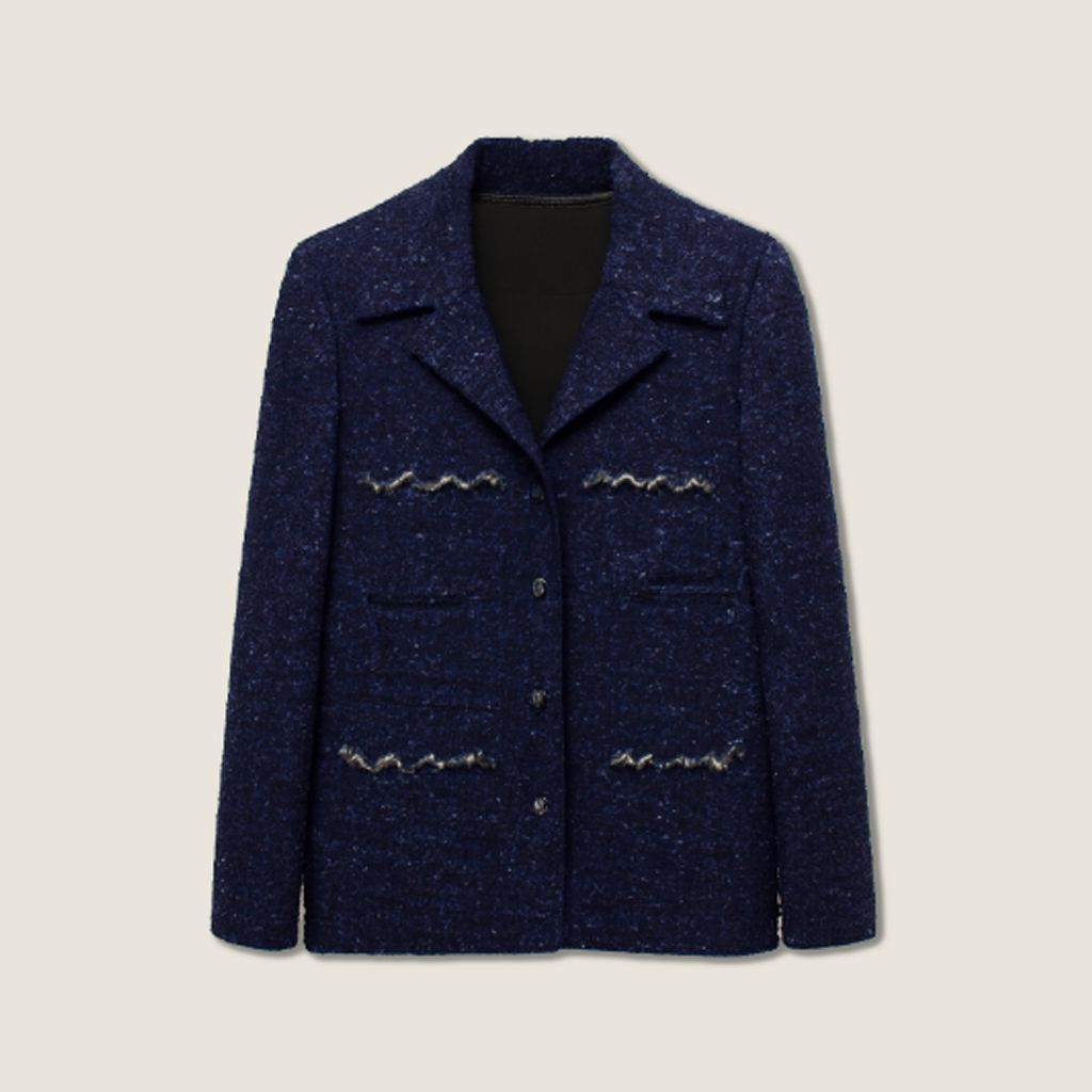 Features: Crafted in navy tweed, the jacket is defined by a structured lapel collar and a button-front closure. It is elevated with contrast stitching on four patch pockets, lending a refined, artisanal touch.
