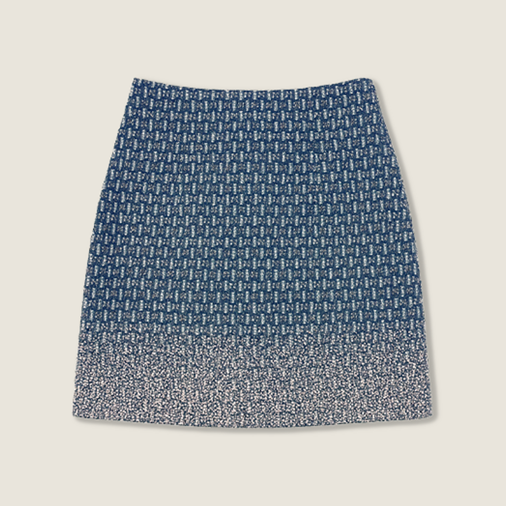 Features: Defined by a striking ombre effect, this tweed set combines a cropped jacket with a sleek, tailored skirt. The fabric's subtle texture and gradient pattern create a modern twist on a classic design.