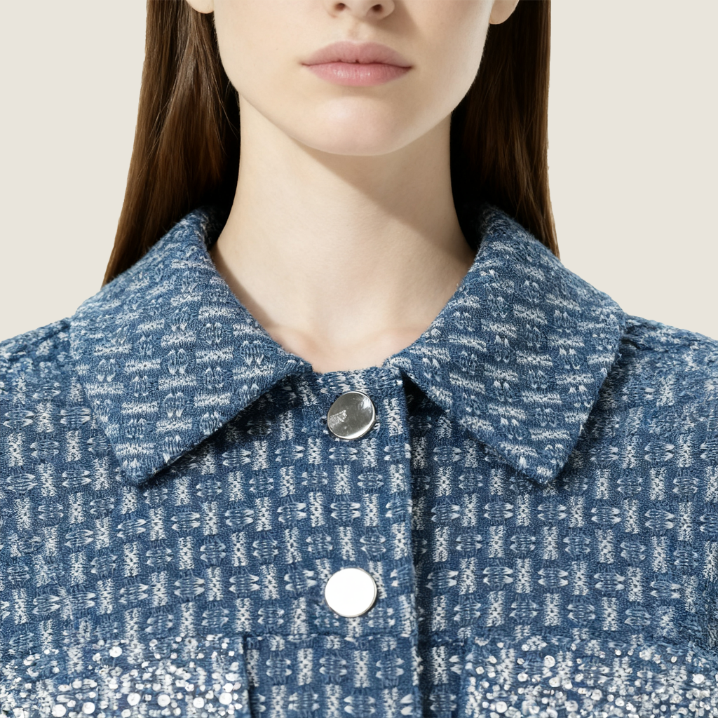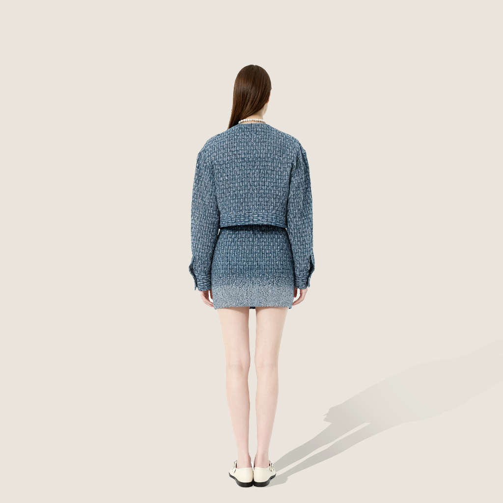 Fit: The jacket features a boxy, cropped fit with a structured silhouette, while the skirt offers a form-flattering shape that gently tapers for a refined, polished look.