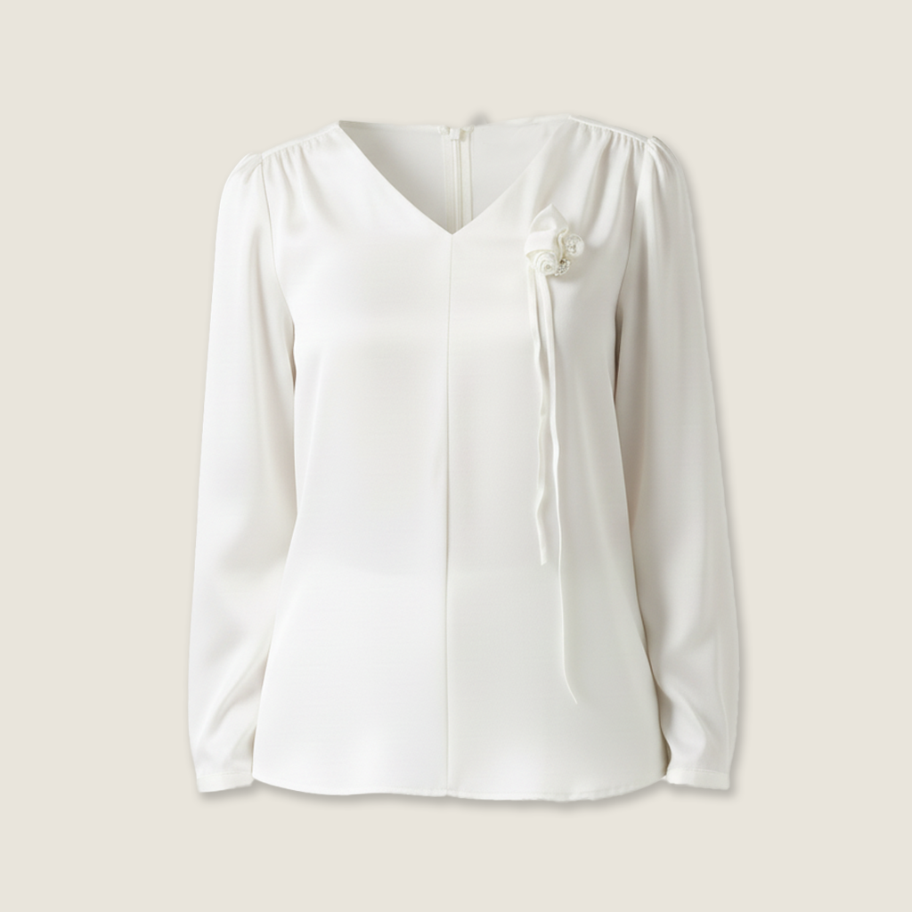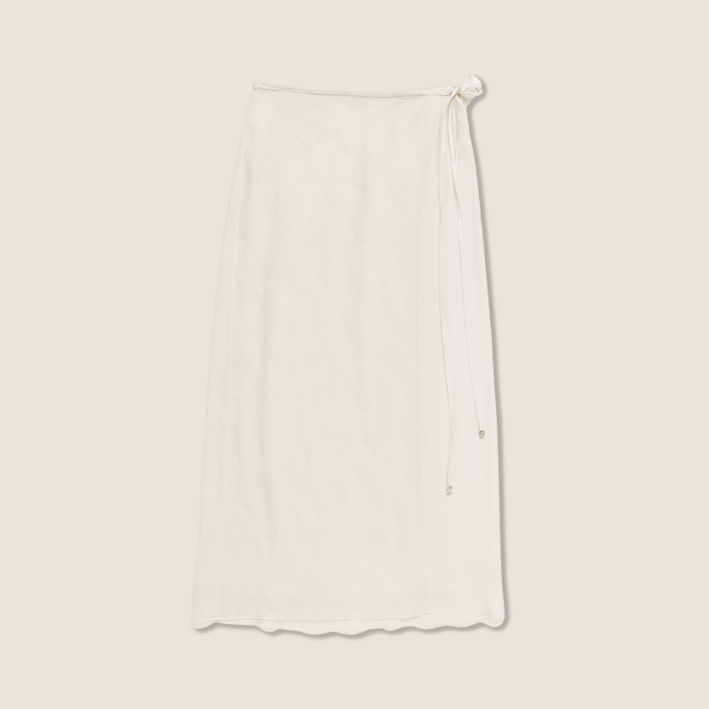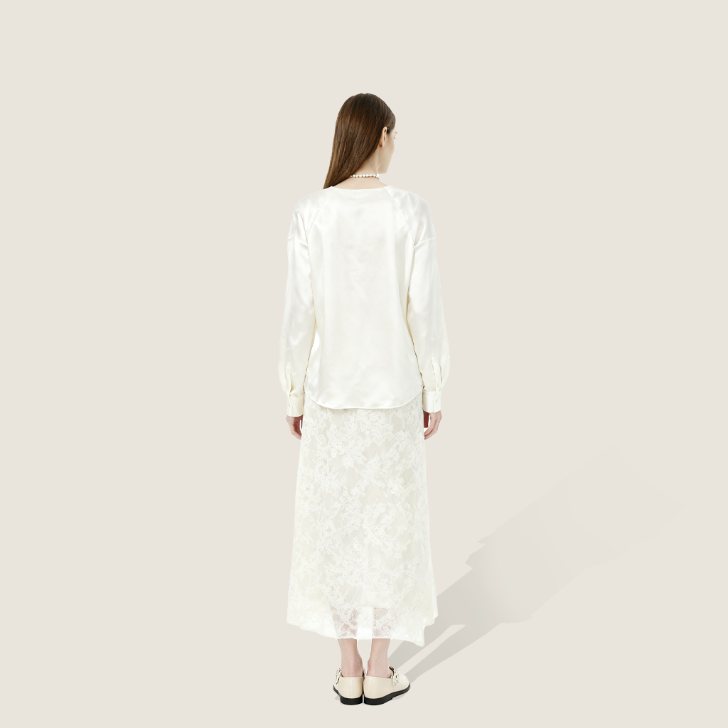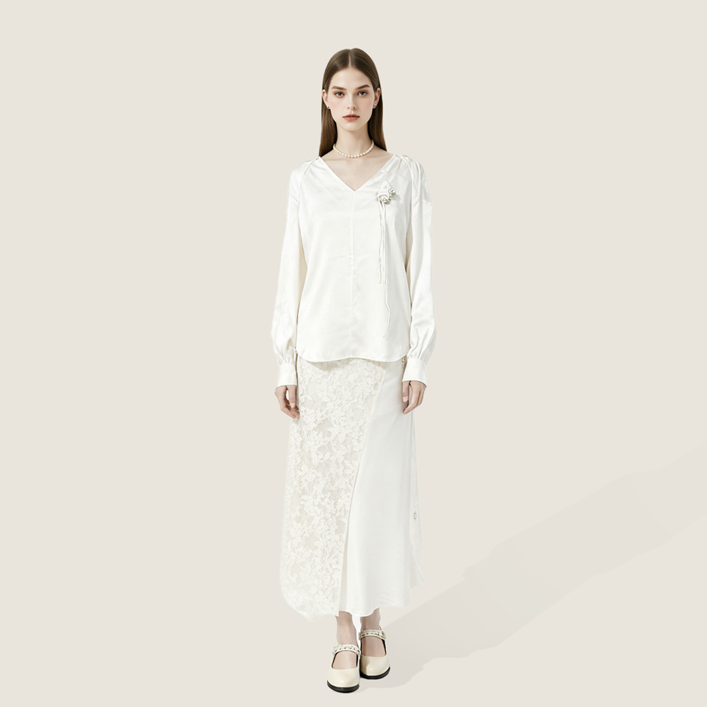 Features: A luxurious satin finish with a flattering V-neckline, this two-piece set features intricate fabric composition with delicate texture details. The top is paired with a midi-length skirt, both showcasing elegant draping.