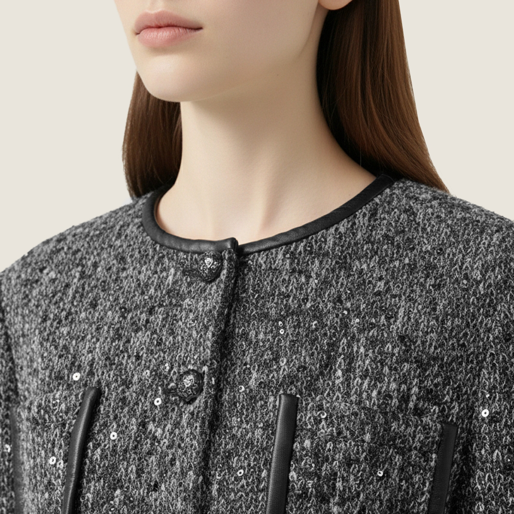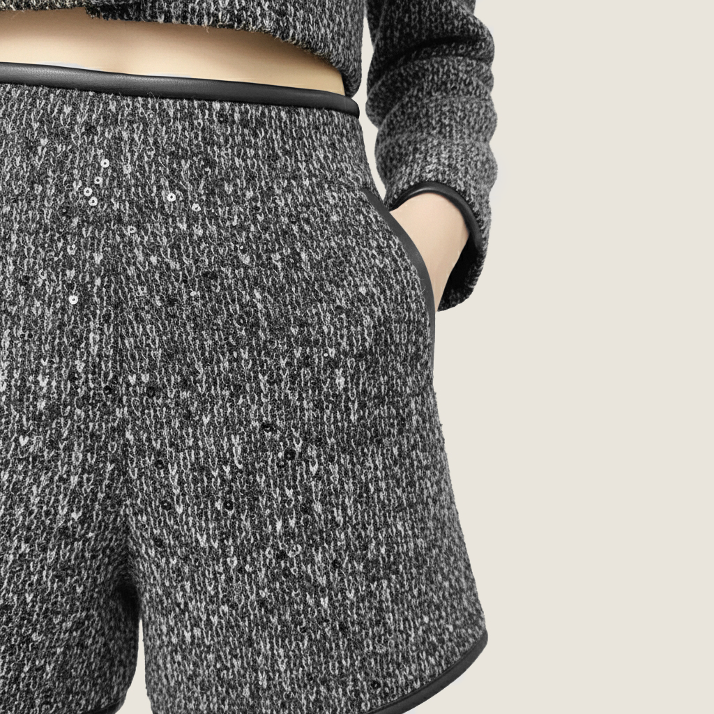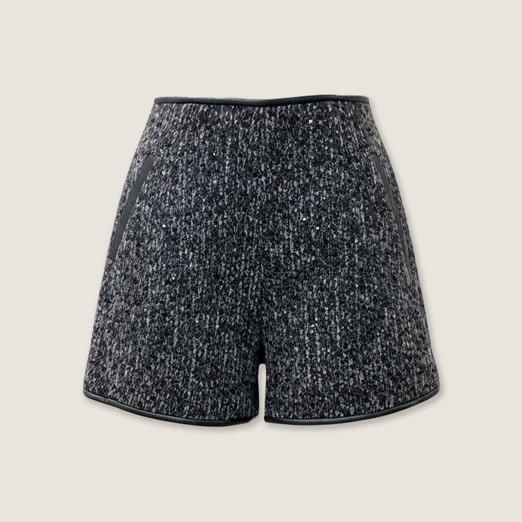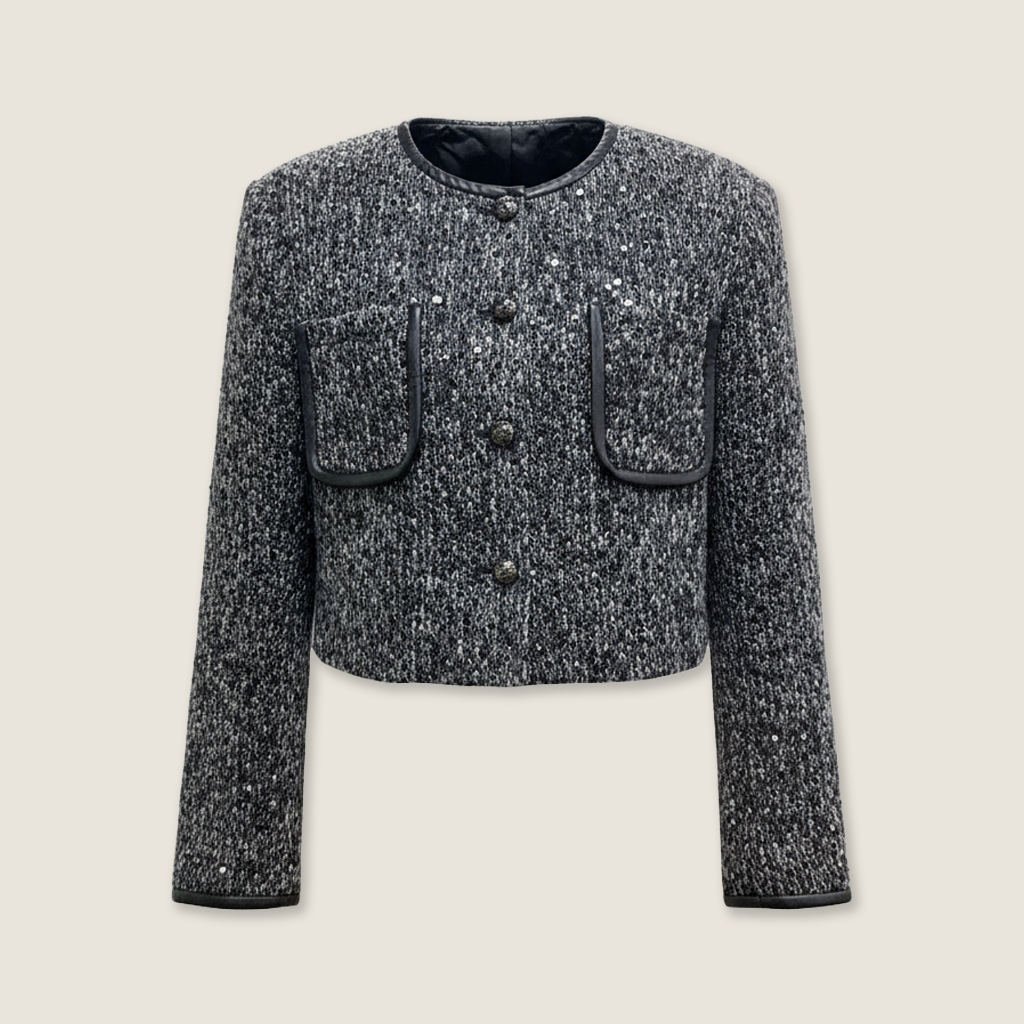 Features:Crafted from textured tweed with subtle sparkle and smooth faux-leather piping for a refined contrast. The cropped jacket pairs effortlessly with tailored shorts, creating a structured yet elegant silhouette.