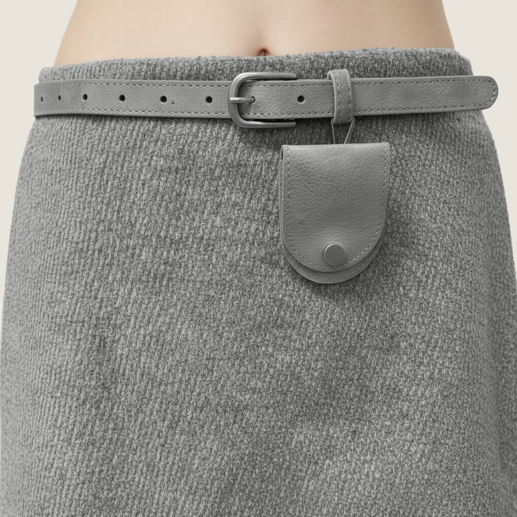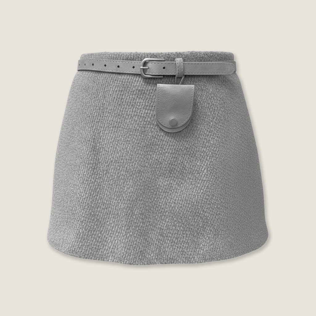 Features: A clean, structured silhouette reimagined with modern precision. The double-breasted blazer features sharp shoulders and tonal buttons that emphasize balance and strength. Paired with a straight mini skirt detailed with a leather-textured belt and pocket accent, the set evokes refined functionality with subtle femininity.
