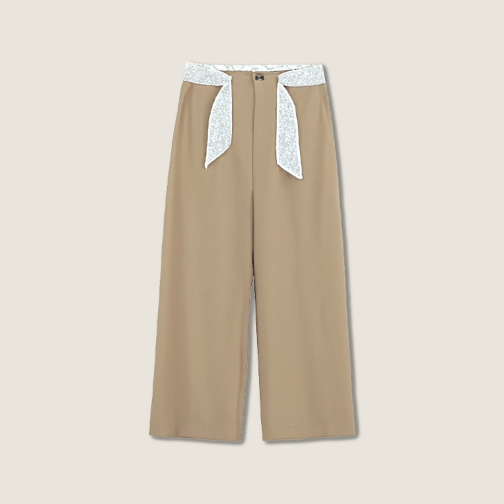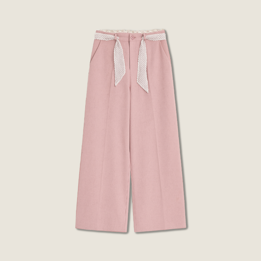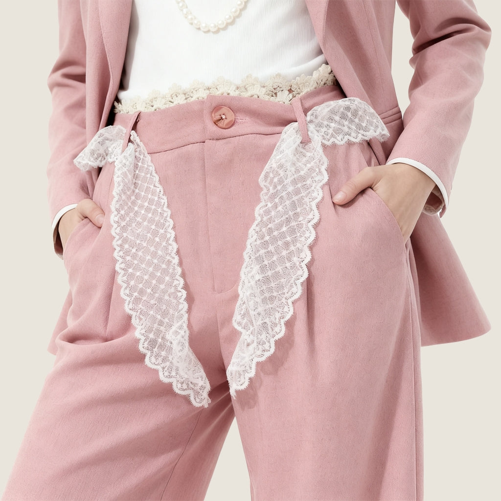 Features: Defined by a clean, tailored silhouette with a modern twist, this set is accented with a delicate lace belt, adding an elegant touch to the bold structure. The jacket's minimalist design is complemented by the wide-leg pants, creating a flattering contrast.