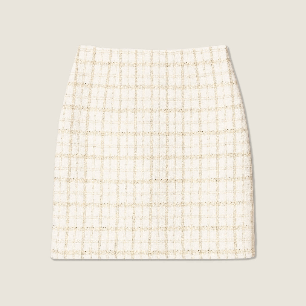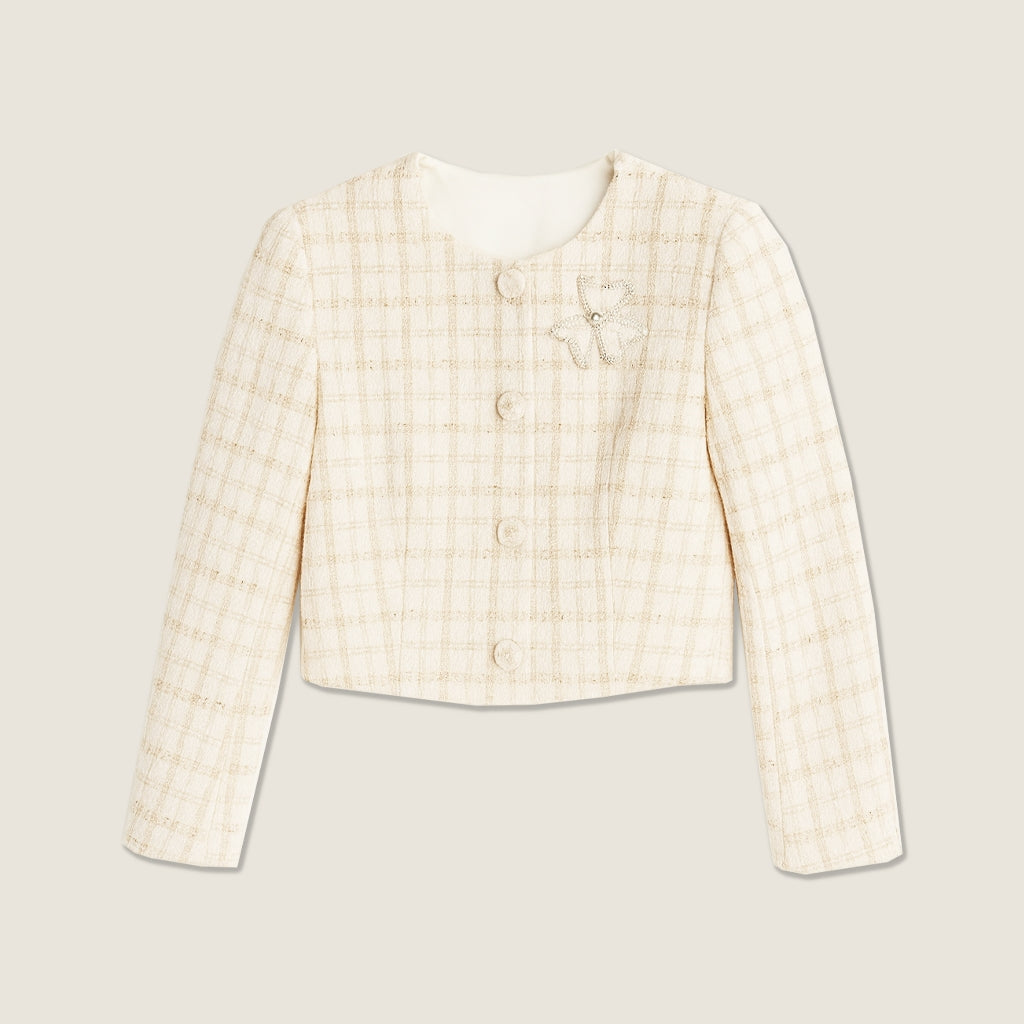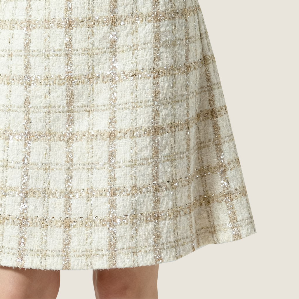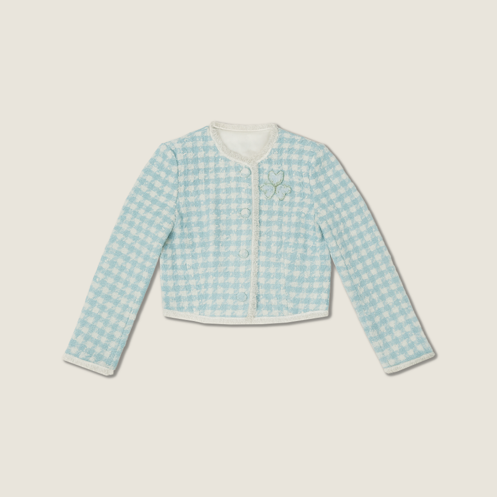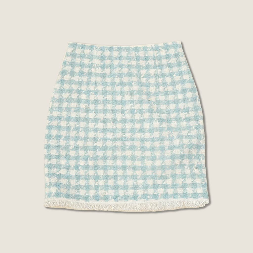 Features: This set features a cropped jacket with a pencil skirt, both crafted in a refined checkered tweed. The 3D floral embellishment on the chest adds texture and depth, while the signature woven trim at the collar, hem, and cuffs enhances the design with subtle elegance.