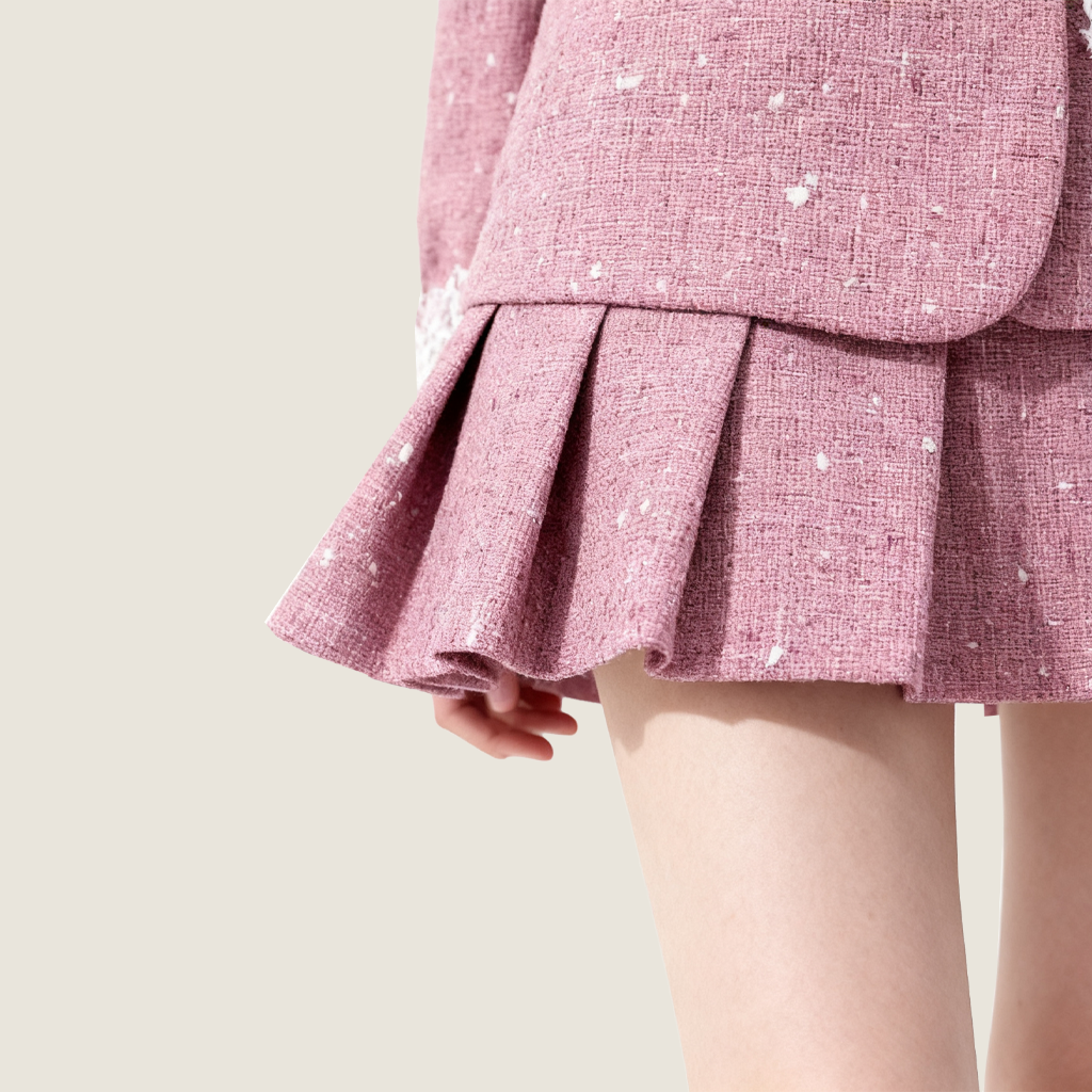 Fit: Designed for a tailored fit, the jacket creates a sharp, flattering silhouette, while the mini skirt offers a relaxed, fluid movement, adding a touch of modern charm to the look.