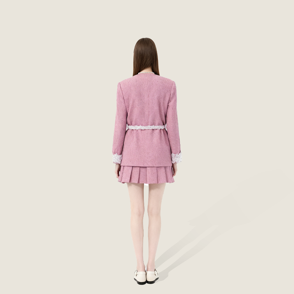 Features: Defined by its soft tweed fabric, this set is accented with delicate lace trim along the sleeves and waist, creating a perfect contrast to its structured design. The jacket's refined silhouette is balanced by the playful mini skirt, making it an elegant yet youthful ensemble.