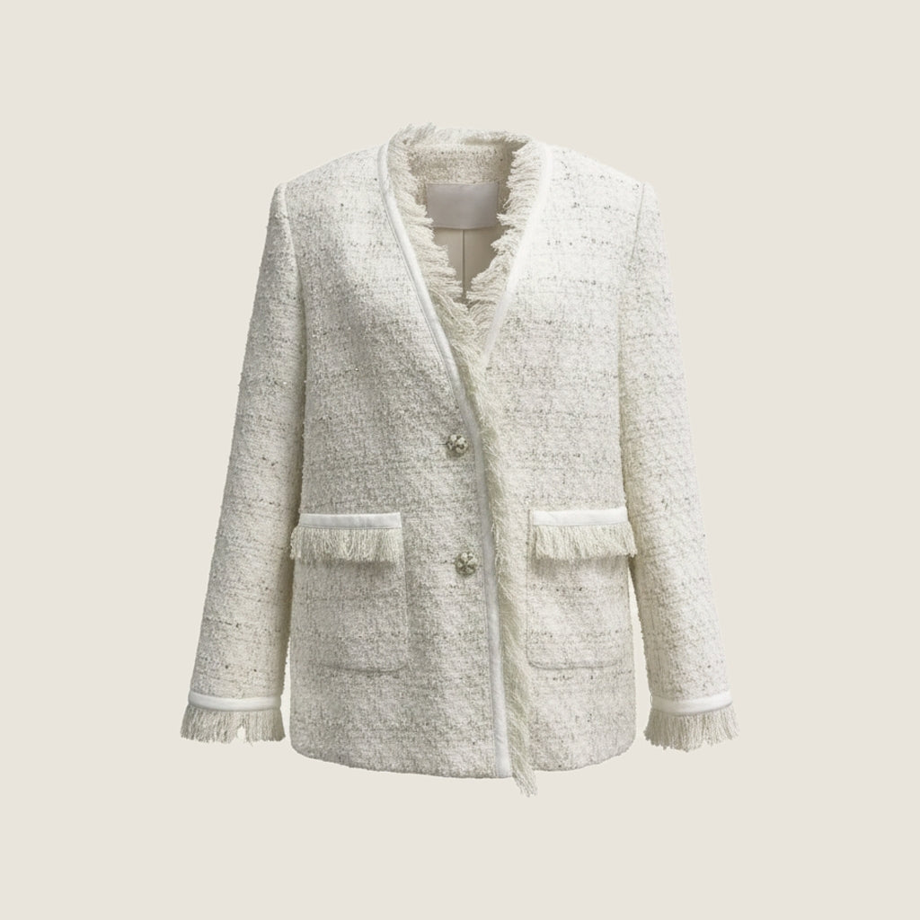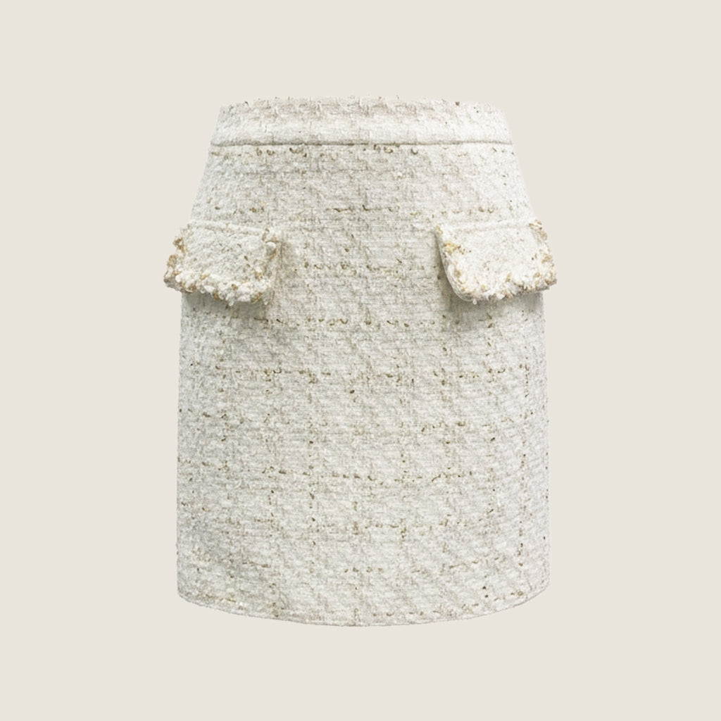 Features: A refined tweed ensemble designed with subtle sparkle and intricate texture. The jacket features hand-fringed trims, pearlized star buttons, and clean leather piping along the edges — a balance of softness and structure. Paired with a straight mini skirt detailed with decorative flap pockets, it conveys a modern elegance with a classic couture touch. The interplay of boucle and smooth leather-like accents gives the set depth and quiet luxury.